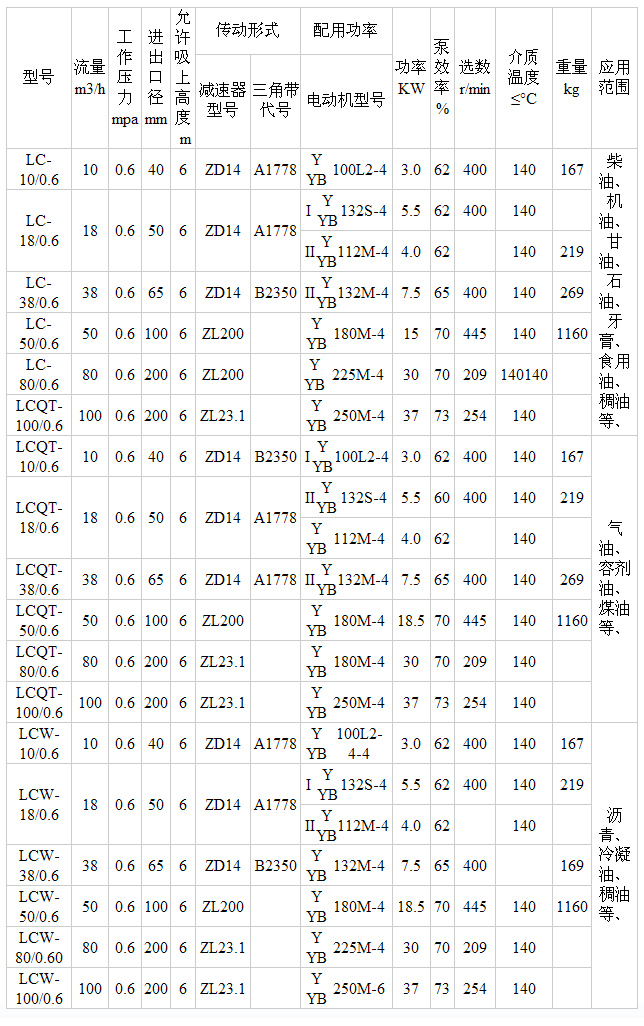 適用于輸送溫度不高于140℃的原油、石油、糖稀、酵母淡堿性及粘度大的液體。